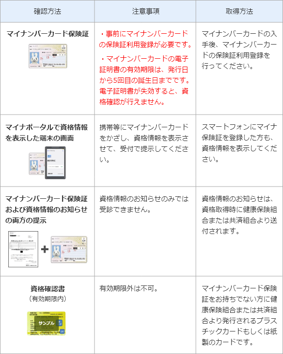 資格確認の方法については、以下の一覧をご確認ください。以下のいずれかの方法で資格確認が可能です。また、マイナンバーカードは、事前に健康保険証利用登録が必要です。